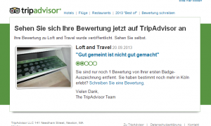 September 2013, DMEXCO Köln. Unser Office bucht Zimmer im Loft & Travel in Köln. Die Website sieht toll aus, offensichtlich ein extrem schickes Vier-Sterne-Haus in Köln. Vor Ort dann die Ernüchterung. Eine tolle Idee, aber von Hobbyhandwerkern lieblos zusammengenagelt. Überall Farb-, Kleb- und Wasserreste, Emporen ohne Geländer, offene Dachfenster in 3m Höhe durch die nachts der Regen tropfte, Spaltmaße wie Scheunentore, Versprechungen auf der Website wie Minibar usw. nicht eingehalten. […]